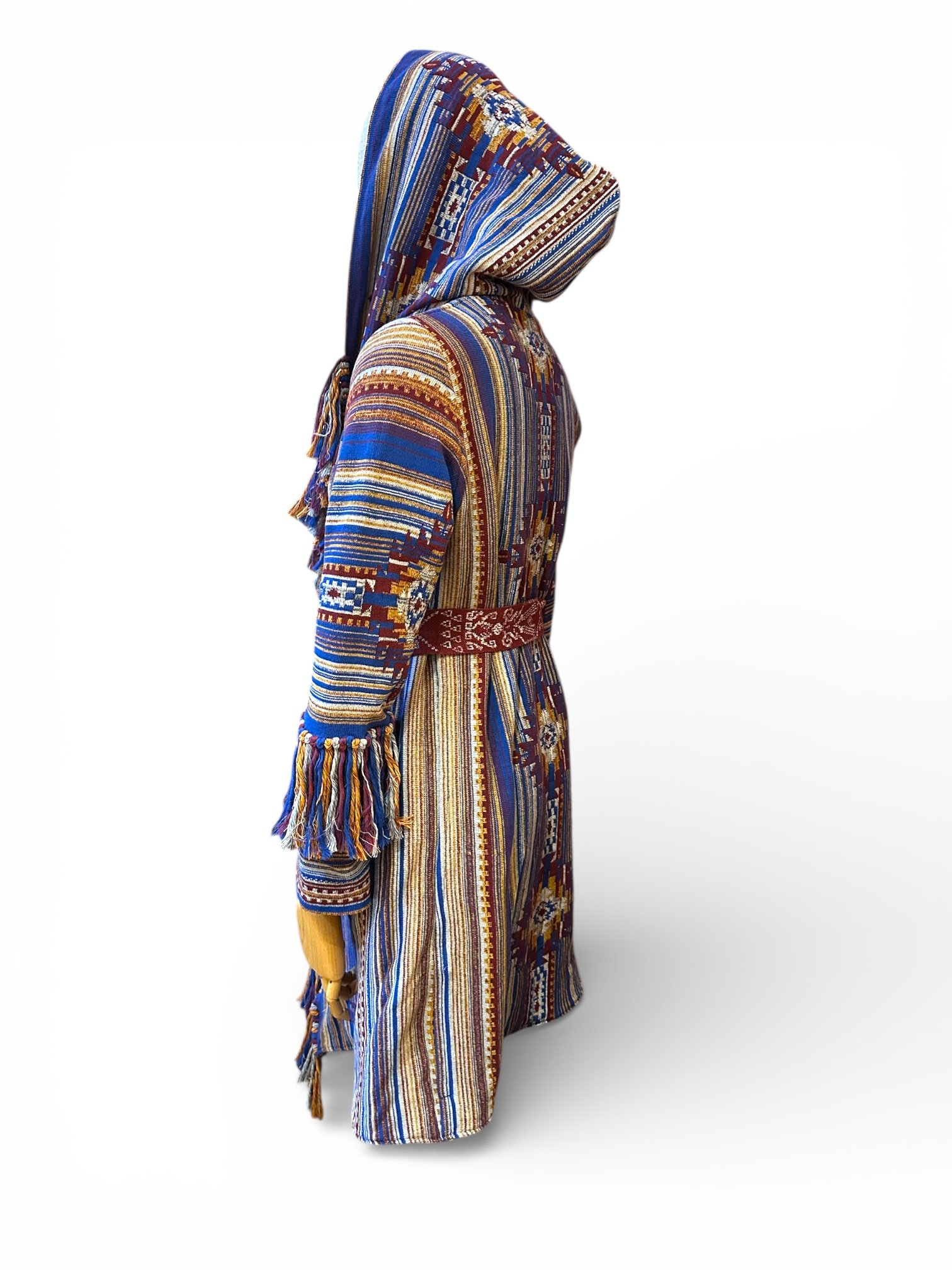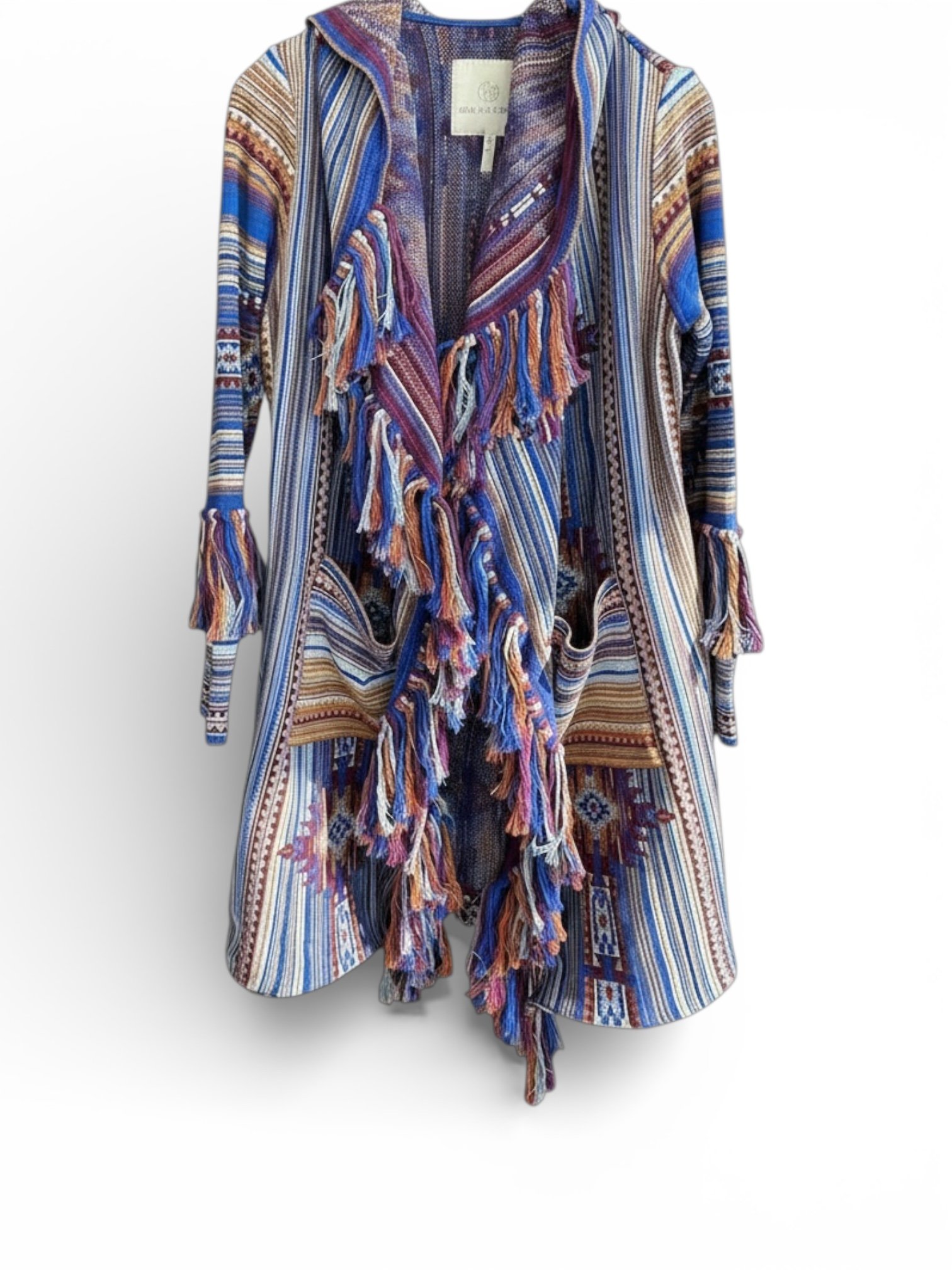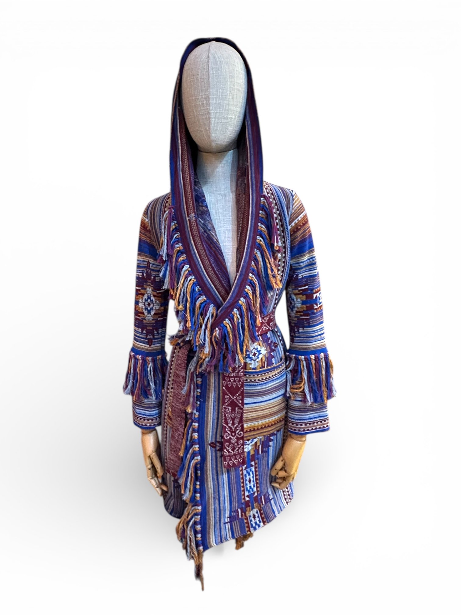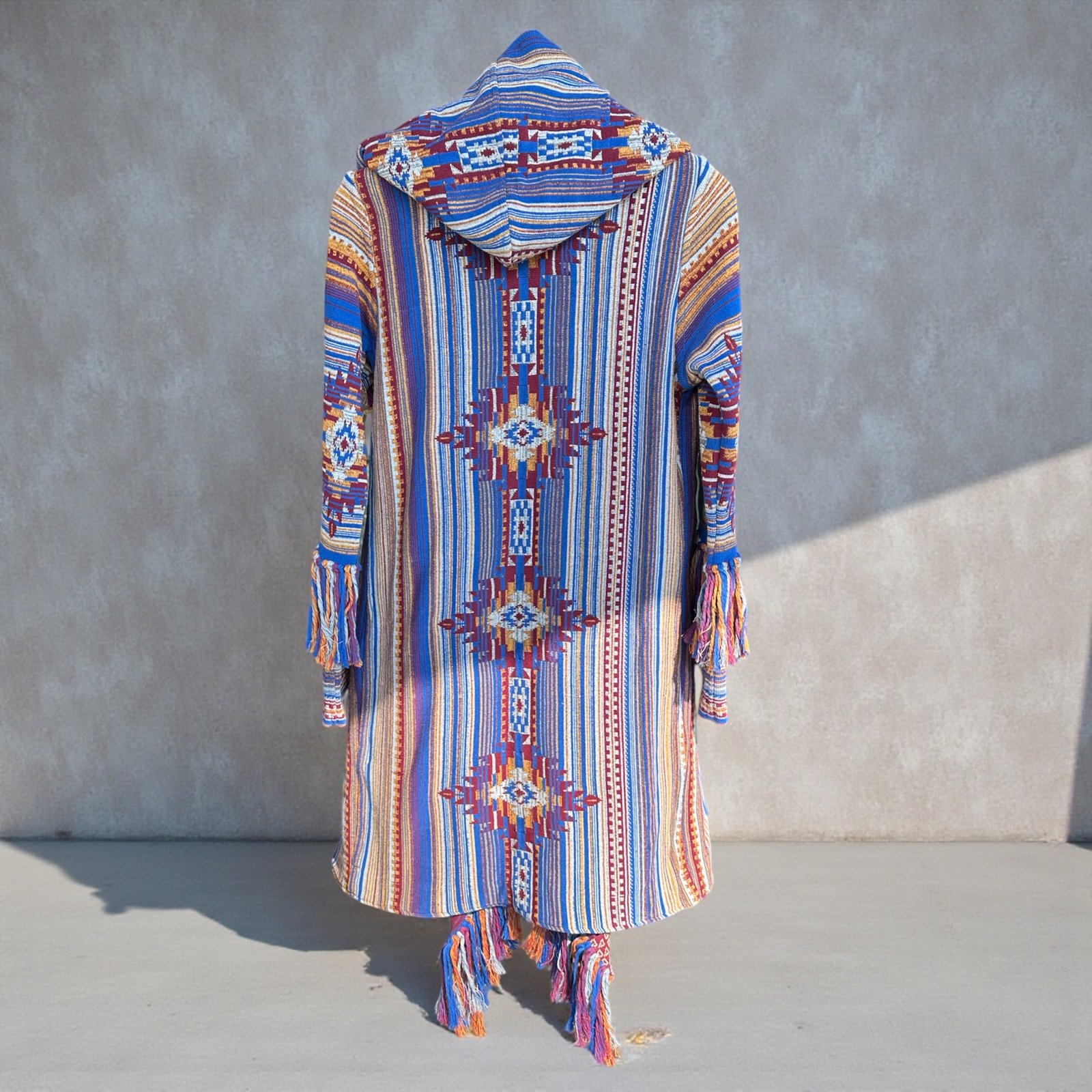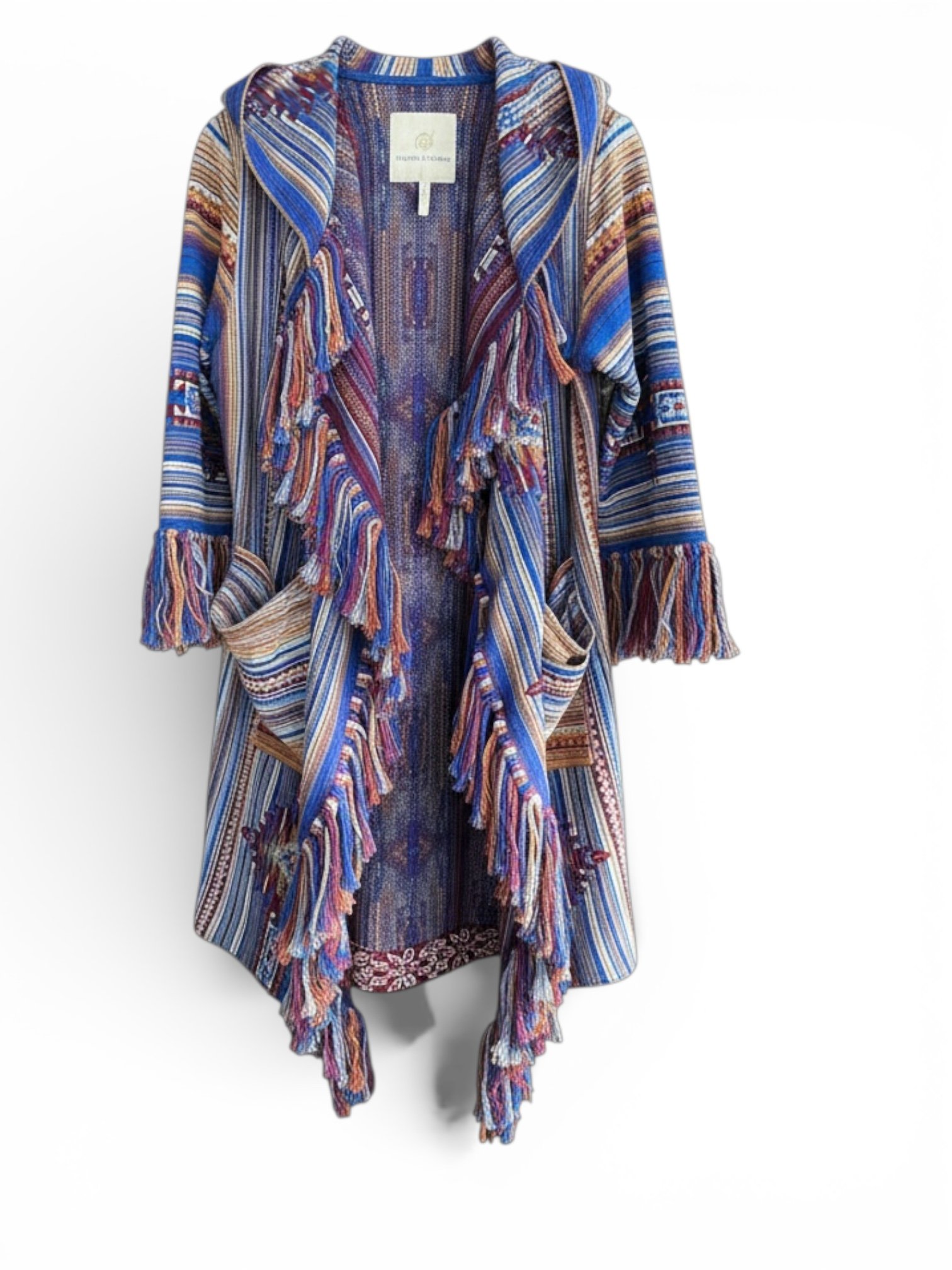 Abrigo para dama tejido abierto al frente de inspiración étnica con aplicación de barba artesanal multicolor.